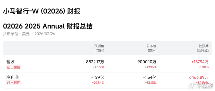 财报显示,2025年,小马智行总营收9000万美元(约合人民币6.29亿元),同比增长20%,归属公司净亏损1.34亿美元,同比收窄51.13%。