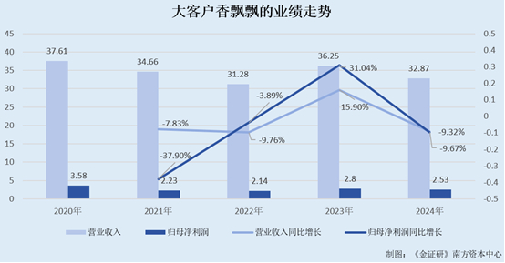 据香飘飘定期报告,2020-2024年,香飘飘的营业收入分别为37.61亿元、34.66亿元、31.28亿元、36.25亿元、32.87亿元。2021-2024年,香飘飘的营业收入分别同比增长-7.83%、-9.76%、15.9%、-9.32%。