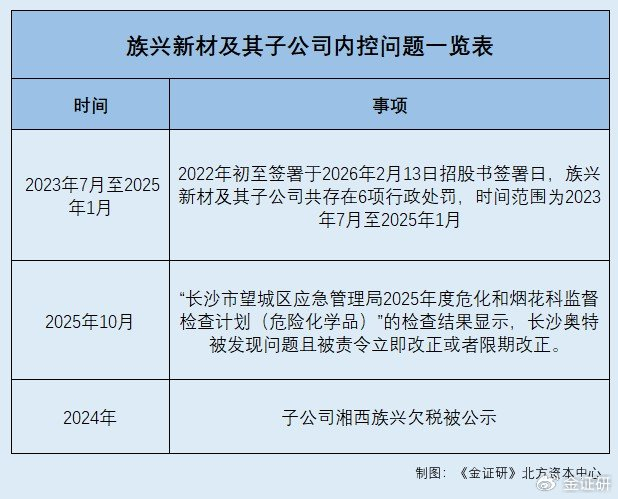 据签署于2026年2月13日招股书,2022年初至签署日,族兴新材及其子公司共存在6项行政处罚,时间范围为2023年7月至2025年1月。其中,2023年7月,族兴新材因未根据职业健康检查报告对需要复查的劳动安排复查,被宁乡市卫生健康局作出警告、并罚款7,000元的行政处罚。