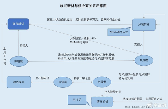 简言之,近三年又一期,族兴新材对泸溪群祥的采购额合计超1,800万元,且族兴新材表示因需求扩大且与泸溪群祥距离近,而向泸溪群祥采购金额增加。需要指出的是,泸溪群祥实控人米成群系族兴新材持股1.41%的股东。族兴新材称除此之外,其与泸溪群祥无关联关系。研究发现,米成群自族兴新材辞职次年成立泸溪群祥。另外,族兴新材子公司湘西族兴生产经理米泽军,与泸溪群祥专利发明人米泽世的姓名仅“一字之差”。不仅如此,湘西族兴与泸溪群祥同处一园区。