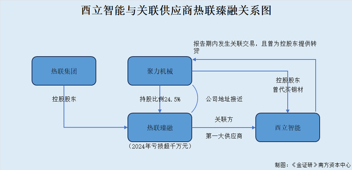 不仅如此,报告期内,酉立智能原材料采购短期出现困难,聚力机械具备较高的银行票据授信额度等,曾为酉立智能代买钢材。与此同时,2021年,控股股东参与设立钢材企业江苏热联臻融供应链管理有限公司(以下简称“热联臻融”),次年热联臻融开始与酉立智能合作,2024年成为酉立智能第一大供应商。