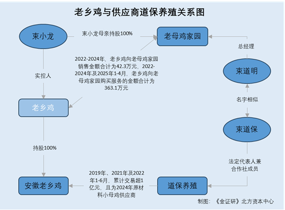 也就是说,2019年、2021年及2022年1-6月,老乡鸡全资子公司安徽老乡鸡向道保养殖累计采购超亿元,且道保养殖系彼时安徽老乡鸡前五大供应商中唯一合作社性质企业。此外,2024年,道保养殖仍为安徽老乡鸡原材料小母鸡供应商。值得注意的是,老乡鸡实控人束小龙母亲张琼控制的老母鸡家园与老乡鸡存在关联交易,且老母鸡家园的总经理“束道明”,与老乡鸡供应商道保养殖的法定代表人兼成员之一的“束道保”名字相似,关系或待解。