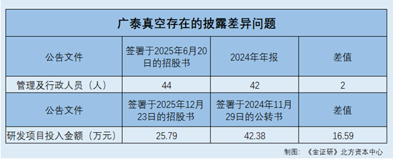 资本市场的健康发展离不开上市公司质量的提升,而信息披露制度是推动上市公司治理水平提高的重要工具。此番上市,广泰真空年报披露的2024年末“管理及行政人员”数量,比起年报中披露的数量或多2人。此外,其一项研发项目2024的投入金额,或比公转书中披露的该项目2024年1-4月的投入金额还少,令人费解。