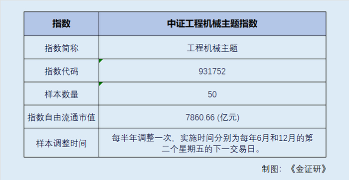中证工程机械主题指数选取50只业务涉及起重机、土方机械、混凝土机械等工程机械整机制造,液压、轴承等零配件制造以及工程机械租赁等领域的代表性上市公司证券作为指数样本,以反映工程机械主题上市公司证券的整体表现。