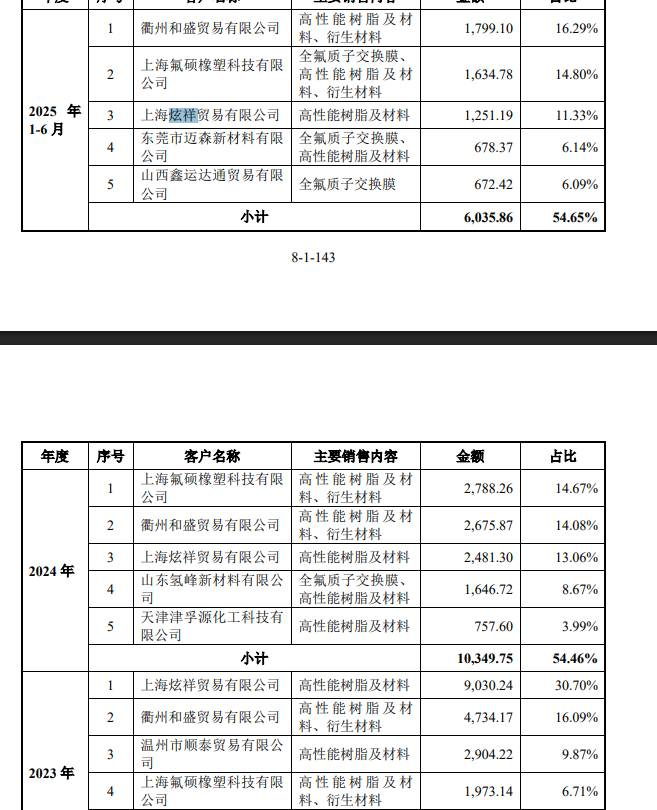 回复函显示,2024年,上海氟硕新增为未来材料前五大客户之一,但根据公司披露的向贸易商客户销售情况显示,2023年、2024年和2025年上半年,未来材料向上海氟硕销售金额分别为1973万元、2788万元和1634万元,分别位居第四位、第一位和第二位。