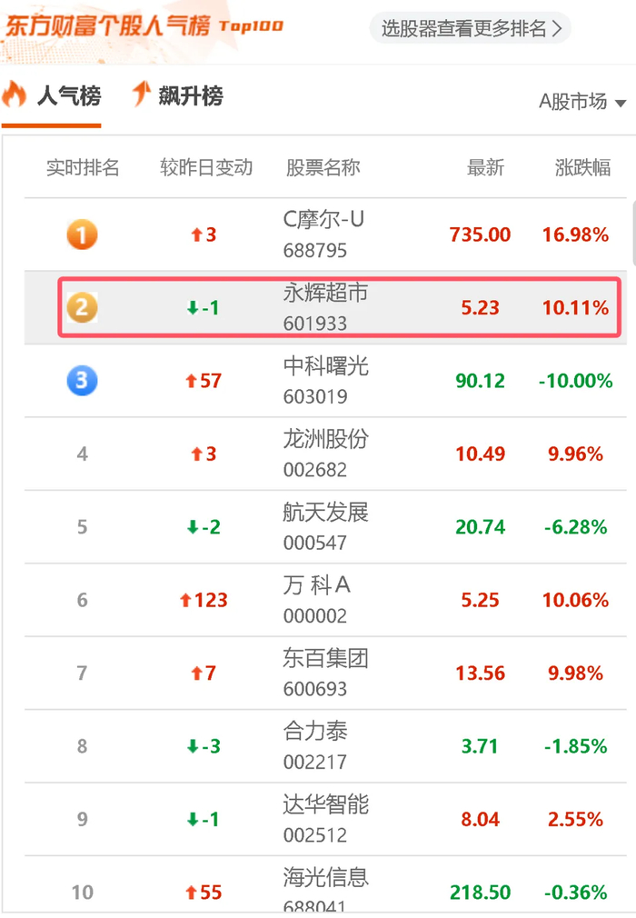 目前,永辉超市热度高居两市所有上市公司第2名,热度仅次于刚上市的“中国英伟达”摩尔线程。