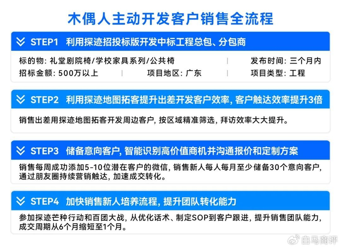 佛山高明的木偶人家具,创始人蒋总是阿里铁军出身,对产品要求严格但最开始的营销方式以强度为先:业务员用最原始的扫楼方式找客户,三天都未必能碰上一个真正有工程项目的有效客户。信息不对称,两眼一抹黑。