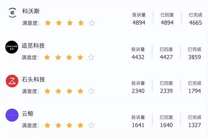 从纸面数据来看:黑猫投诉[下载黑猫投诉客户端]平台上,科沃斯、追觅、石头科技与云鲸智能的累计投诉量分别为4894、4432、2340与1641;而在京东2025年第四季度售后统计中,四家的产品返修率则分别为3.2%、4.8%、2.1%与1.9%。