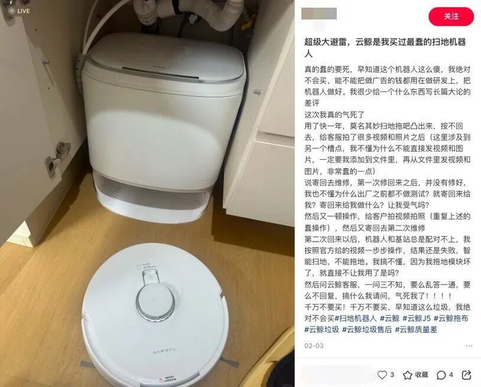 更关键的是,功能创新在价格面前,开始遭遇实用性的拷问。有用户在社交平台反馈,云鲸后期推出的AI脏污识别存在过度清洁、识别不稳定导致路径混乱等问题;拖布外扩、热活水清洁等功能,对实际清洁效果的提升也并不显著。