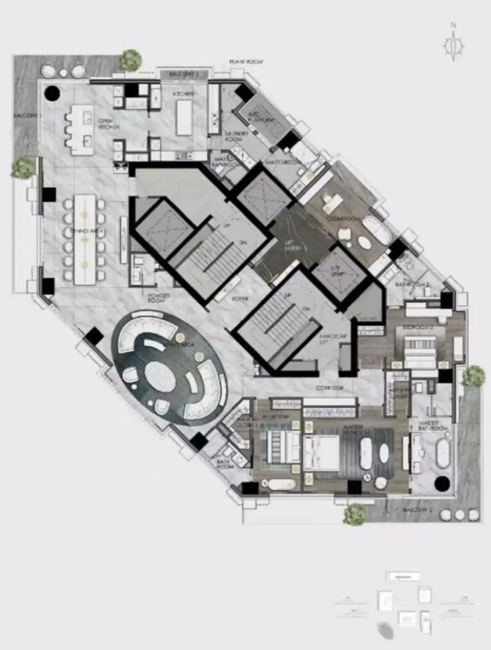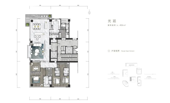 406㎡户型,125平米的餐客厅,15.9米超大面宽与270度1.5米宽的大露台,保姆有独立卫生间和电梯。