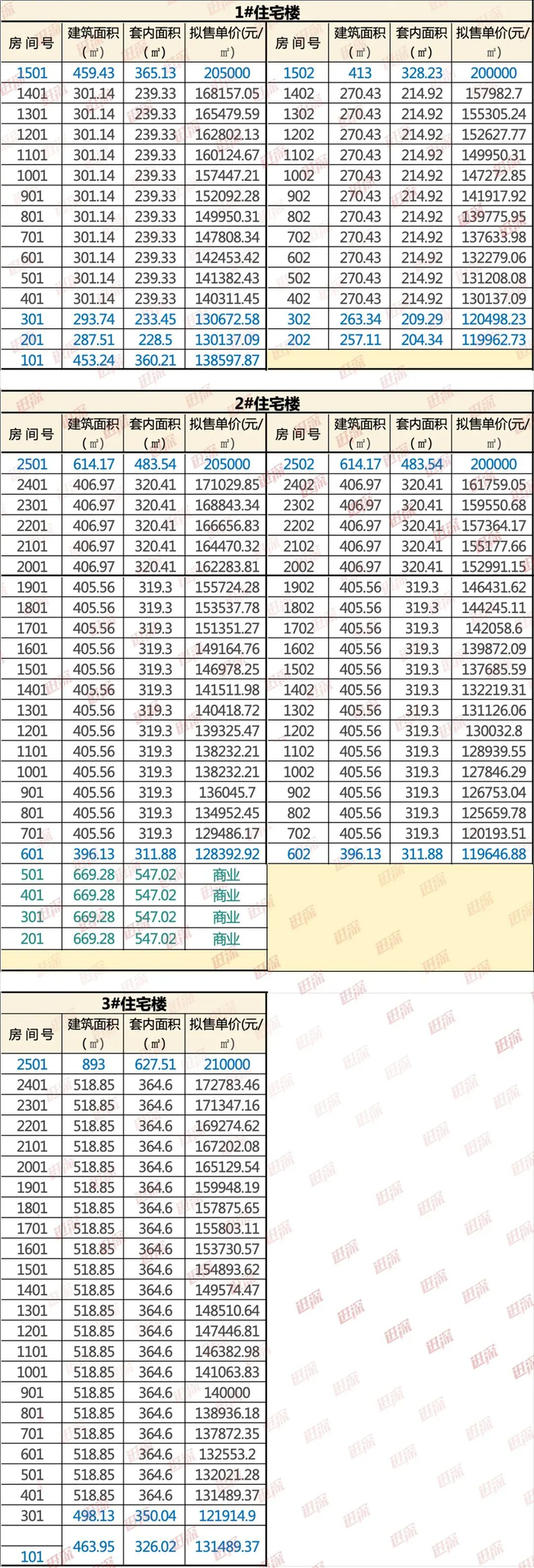 2套顶复,建面614㎡,拟售均价分别为20.5万元/㎡和20万元/㎡,单套总价超1.2亿元。