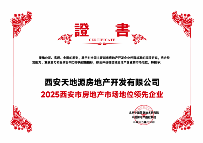 获奖证书面对行业深度调整,作为根植于西安的国有上市房企,天地源坚持深耕城市核心区域。2025年三季度,公司成功竞得西安高新软件新城一宗125亩住宅用地,新增权益计容建面约19.22万㎡,进一步夯实了区域发展基础。战略深耕推动市场表现稳步提升:据中指数据监测,2025年1-11月,天地源以28.4亿元的商品房销售金额,稳居西安本土房企销售业绩榜首。