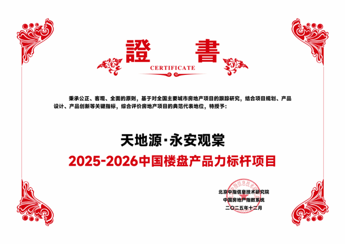 12月11日,由北京中指信息技术研究院主办,中国房地产指数系统、中国物业服务指数系统承办的“2025中国房地产大数据年会暨2026中国房地产市场趋势报告会”在北京召开。西安天地源房地产开发有限公司凭借较强的经营能力和发展潜力,获评“2025西安市房地产市场地位领先企业”,永安观棠项目同时荣获“2025-2026中国楼盘产品力标杆项目”。