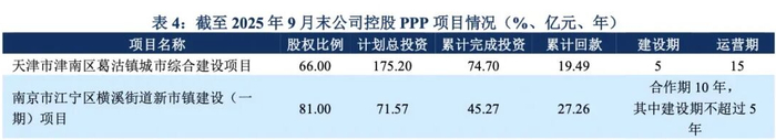 更别提ppp项目,天津市津南区葛沽镇城市综合建设项目的建设期5年,运营期15年,中建方程计划总投资175.20亿元,截至2025年9月末,累计完成投资74.7亿元,累计回款19.49亿元。