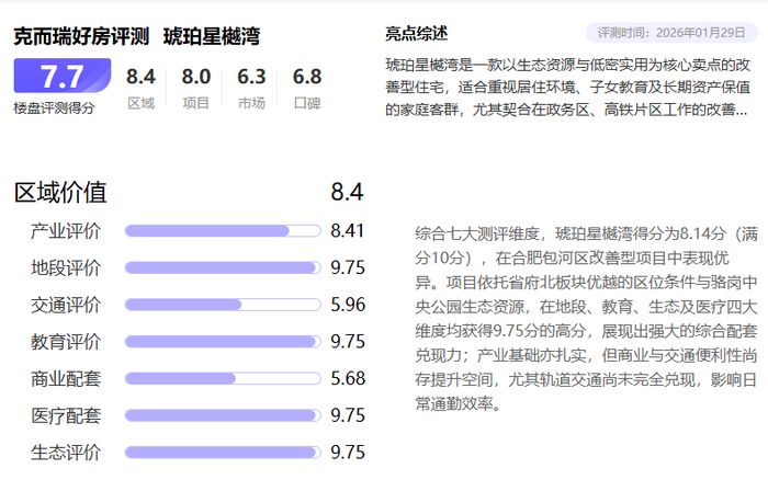 作为依托 CRIC 大数据 + AI 智能测评体系,从区域价值、项目价值、市场表现、市场口碑四大维度量化比拼的权威榜单,这份荣誉是对项目产品力、配套力与品牌力的全方位认可。琥珀星樾湾能在包河改善赛道脱颖而出,绝非偶然,而是精准契合区域人居需求的必然结果。