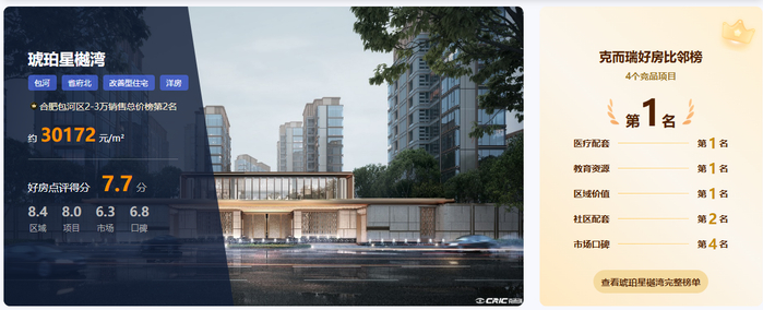 近日,克而瑞好房点评网比邻冠军榜重磅揭晓,包河区合肥城建琥珀星樾湾凭借硬核综合实力,斩获同区域改善型竞品项目第一名的殊荣。