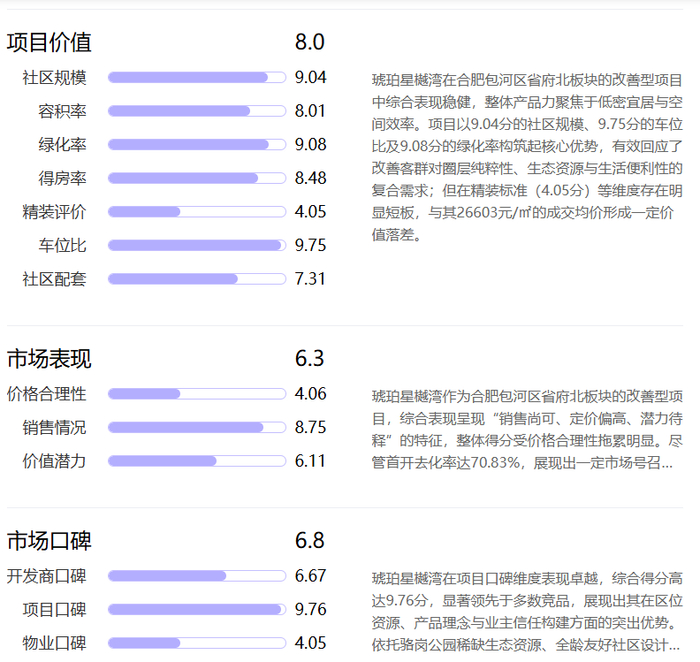 市场表现与口碑是衡量项目竞争力的关键,琥珀星樾湾在这两大维度同样表现亮眼。市场表现得分 6.3 分,虽受价格合理性(4.06 分)影响略有波动,但首开去化率达 70.83%,展现出强大的市场号召力。项目备案均价 26603 元 /㎡,相较于同板块改善型项目,以更具竞争力的定价,实现 “高配置、低溢价” 的价值平衡,精装标准涵盖威能地暖、霍尼韦尔新风系统、博世厨电等一线品牌,无隐性增项,“高性价比” 成为吸引改善客群的核心卖点。