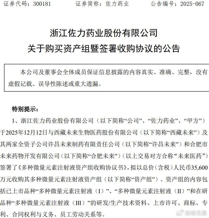 其公告称,佐力药业拟以总价3.56亿元收购西藏未来生物医药股份有限公司(简称“未来医药”)及其两家全资子公司——许昌未来制药有限责任公司和合肥市未来药物开发有限公司持有的标的资产组。