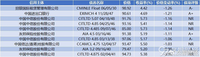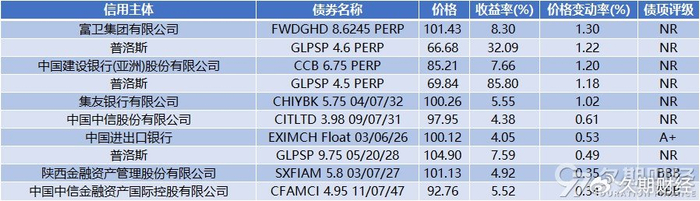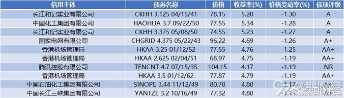 金融板块方面,保诚PRUFIN 3.125 04/14/30和PRUFIN 3.625 03/24/32(1207.5万美元和600万美元),远东宏信FRESHK 5.875 03/05/28(310万美元),招银国际租赁CMINLE 3.625 07/03/29(216万美元);