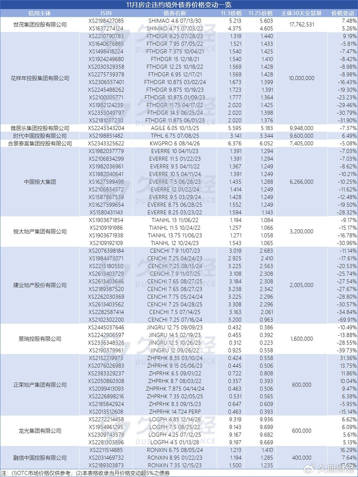 公司公告及消息方面,泛海控股2只美元债未能如期兑付,规模约3.56亿美元,发行人已提议进一步展期至2026年5月23日;持有中骏集团控股范围内债务未偿还本金总额约78%的计划债权人已加入重组支持协议;百慕达法院颁令要求天誉置业清盘;龙光集团拟议修订LOGPH 7 PERP条款,包括新增股份赎回权等条款;时代中国控股预期重组生效日期将为11月28日;易居企业控股已与初始同意债权人及附属公司担保人订立重组支持协议;富力地产1只本金16.8亿元的债券已通过重组方案;融信中国拟对旗下6只公司债展期6个月;奥澌资本拟通过拍卖程序出售其附属公司彩生活服务集团最多29.9%股份,花样年控股正就未经授权强制执行所谓担保权利寻求法律意见维护权益;宝龙地产未能按期支付优先级资产支持证券的本息,构成实质性违约,附属公司于维京法庭被提出的清盘申请;弘阳地产延长基础重组支持协议费用期限至12月29日;华夏幸福债权人龙成建设申请对公司进行预重整,廊坊中院已受理;大悦城地产于11月27日退市。