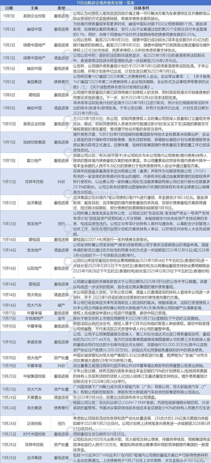 本月房企债务重组方面,融创中国境内外债务重组已全面落地,化解债务近600亿元;远洋旗下7只公司债券重组成功,余下3笔银行PPN重组仍在推进中;融信中国拟对旗下6只公司债展期6个月。清盘方面,百慕达法院颁令天誉置业清盘;宝龙地产全资附属于维京法庭被提请清盘;绿景中国地产呈请聆讯进一步延期至2026年2月16日。