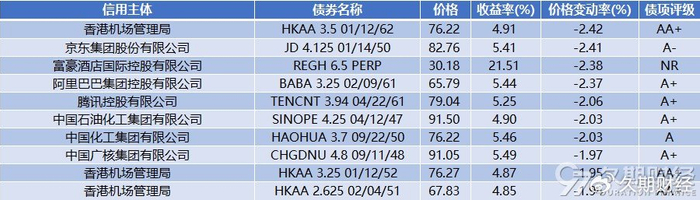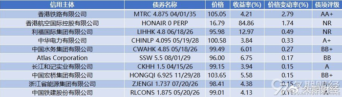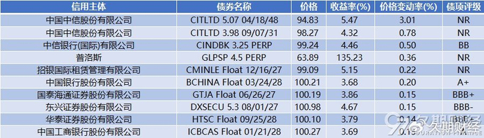 金融板块方面,保诚PRUFIN 3.125 04/14/30和PRUFIN 3.625 03/24/32(1794.7万美元和1198.3万美元),东亚银行BNKEA 6.625 03/13/27(310.5万美元),友邦保险AIA 3.375 04/07/30(204.2万美元),工商银行ICBCAS 4.5 01/19/26(200万美元);