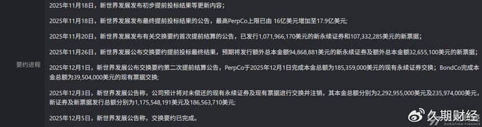 新世界发展发布公告,完成交换要约第二次提前结算,相关实体分别完成本金总额为185,359,000美元的现有永续证券交换以及完成本金总额为39,504,000美元的现有票据交换。此外,公司已完成对未偿还的现有永续证券及现有票据的交换并予以注销,其本金总额分别为2,292,955,000美元及235,974,000美元。新发行人已分别发行本金总额为1,175,548,191美元的新永续证券及本金总额为186,563,710美元的新票据。