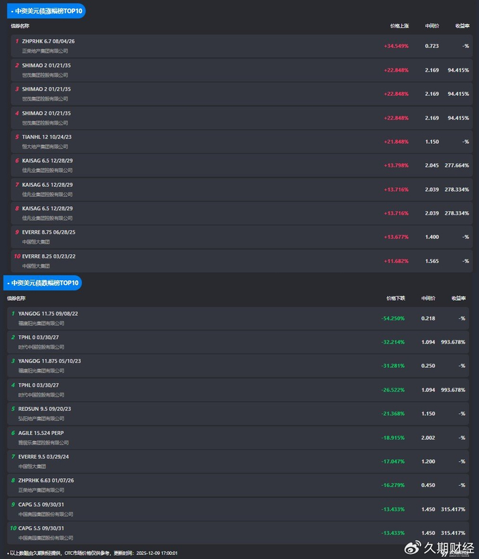 12月9日,中资美元债涨跌幅榜TOP10如下: