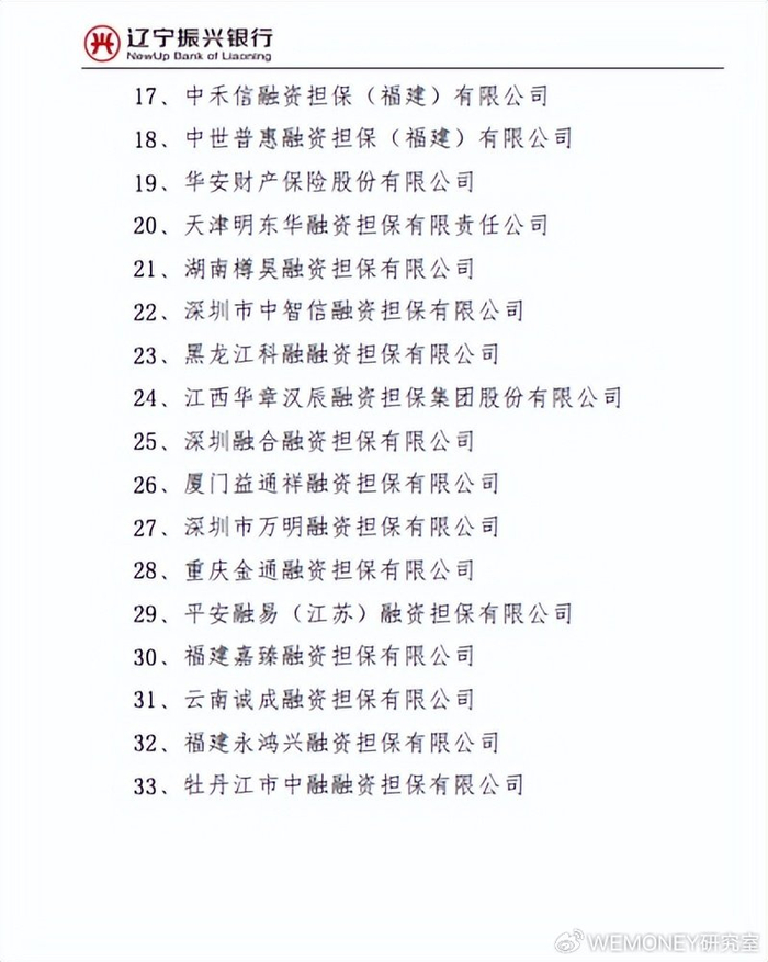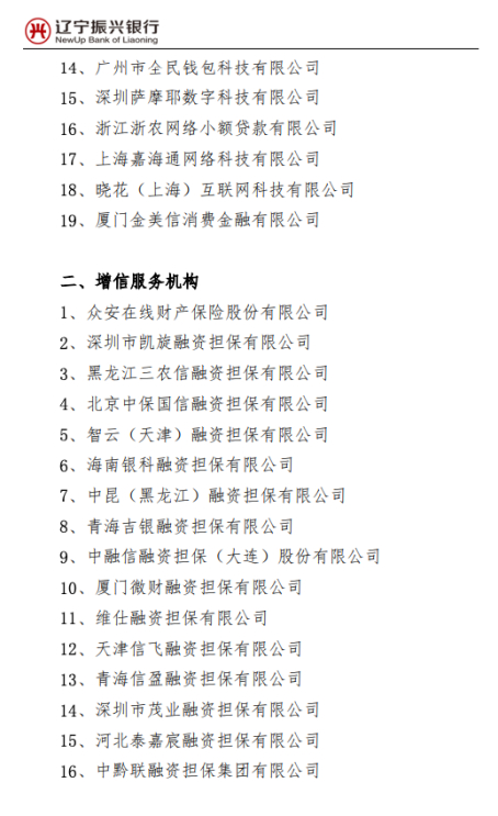 从已披露的信息来看,振兴银行的合作网络包括19家平台运营机构和33家增信服务机构。其中,平台运营机构涵盖多家知名互联网企业旗下的持牌金融机构,融资担保公司等增信机构也位列其中。
