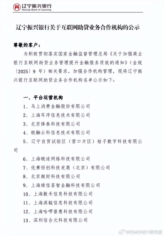 近期,振兴银行又更新其互联网助贷业务合作机构名单。该行合作机构包括19家平台运营机构和33家增信服务机构。这一合作格局体现了振兴银行'深度垂直'的发展策略,即通过与众多区域性、细分领域机构开展合作,深耕特定客群和场景。
