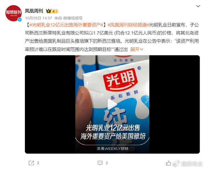 为缓解资金压力,光明乳业不得不走上出售资产“回血”之路。今年9月公告显示,光明乳业计划以12亿元的价格,将子公司新莱特位于新西兰北岛的资产转让给新西兰雅培公司。此次交易若能成功,预计将为新莱特带来充足现金流用于偿债,且在2026财年净利润有望增加1000万至1500万新西兰元。