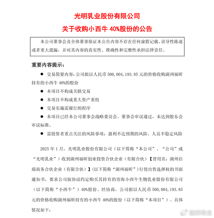 11月28日,光明乳业公告披露,公司拟以5亿元现金收购湖州福昕持有的青海小西牛生物乳业股份有限公司(以下简称“小西牛”)40%股份。加上此前2021年收购小西牛60%股权,光明乳业总花费超11亿元。通过此次交易后,光明乳业将对小西牛实现全资控股。