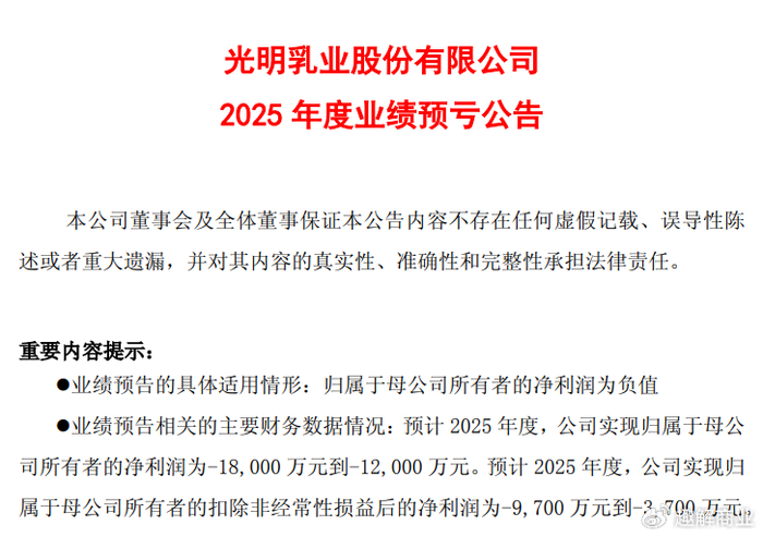 近日,光明乳业公告称,预计2025年度归母净利润为-1.8亿元到-1.2亿元,相较于2024年的盈利7.22亿元的状态出现显著转折。