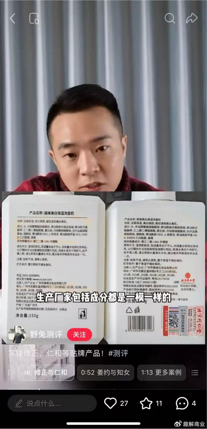 除此以外,社交平台上,早在2023年就有关于修正贴牌的声音。2023年4月7日,一个名称为“野兔测评”的账号发视频称,修正的一款洗面奶与北京同仁堂的一款洗面奶生产厂家及成分一模一样,修正和仁和的两款洗发水,同样是一个生产厂家和同一个配方。