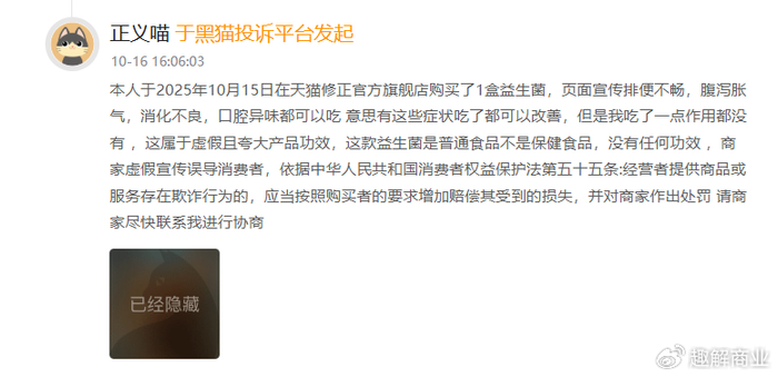 2025年10月16日,有消费者投诉称:“本人于2025年10月15日在天猫修正官方旗舰店购买了1盒益生菌,页面宣传排便不畅,腹泻胀气,消化不良,口腔异味都可以吃 意思有这些症状吃了都可以改善,但是我吃了一点作用都没有,这属于虚假且夸大产品功效,这款益生菌是普通食品不是保健食品,没有任何功效 ,商家虚假宣传误导消费者。”目前,该投诉状态为“已完成”。