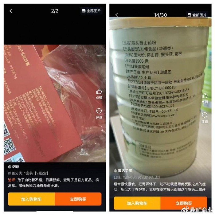修正官方旗舰店内显示,一款“猴头菇山药粉”生产厂家为安徽本草怡堂健康科技有限公司,该公司与修正并无股权关联。