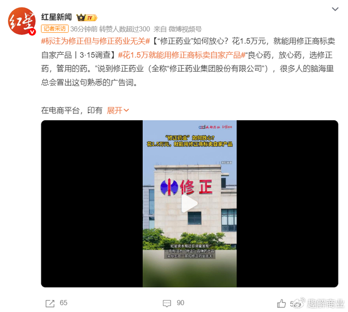 据“红星资本局”报道,电商平台上,一些标注为“修正”品牌的产品,实际生产厂家与修正药业无关。此外,电商平台上部分销售这些产品的店铺,却能出具修正药业的授权书。