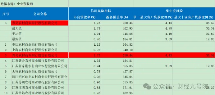 在业绩下滑的同时,青农商行的资产质量问题持续凸显,不良贷款率维持高位,贷款集中度偏高等问题,使其风险抵御能力备受考验,在A股农商行中处于劣势地位。