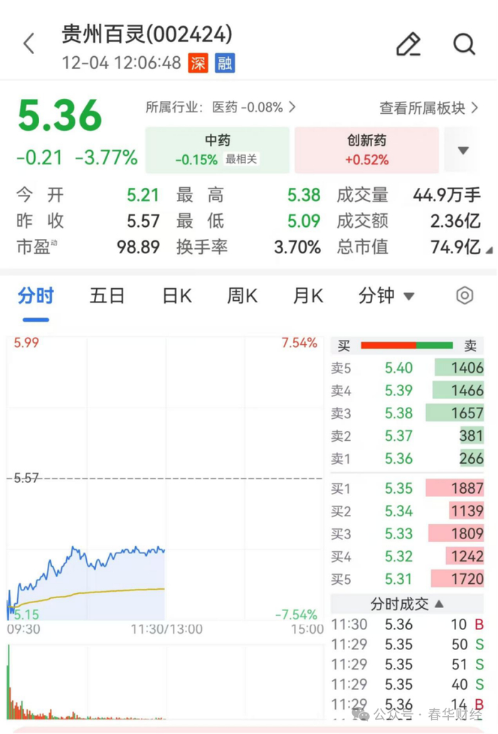 截至发稿,贵州百灵(002424.SZ)今日早盘股价大幅低开,盘中一度跌超7%,午间休市时报5.36元/股,下跌3.77%,半日成交额显著放大至2.36亿元。