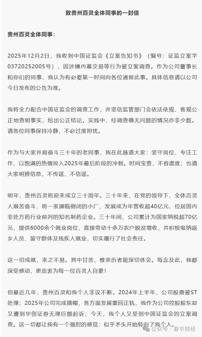 12月3日,贵州百灵企业集团制药股份有限公司发布公告,公司实际控制人、董事长姜伟因涉嫌内幕交易、信息披露违法、违反限制性规定转让股票,被中国证监会立案调查。
