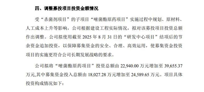 由于置换预先投入募投项目的自筹资金,截至2025年8月31日,泰禾股份“杀菌剂项目 ”累计投资金额达2.68亿元。而公司“研发中心项目”累计投资金额达5589.03亿元,占调整后拟投募资的46%,“结余”6562.37万元。