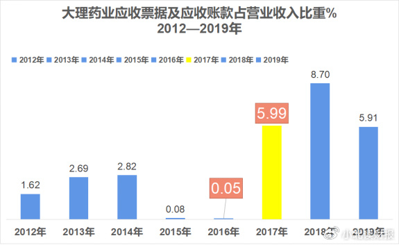 但是上市后大理药业应收账款及应收票据占营业收入的比重,立马翻了数倍,2018年公司每100万收入中,就有8.7万元是应收账款。