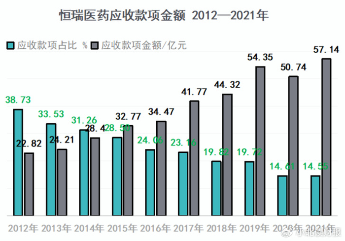 2012年,恒瑞医药每100块钱的总资产中,至少有38块钱的总资产是没有收回来的应收款项;但是到了2021年,这一比重约为15%。