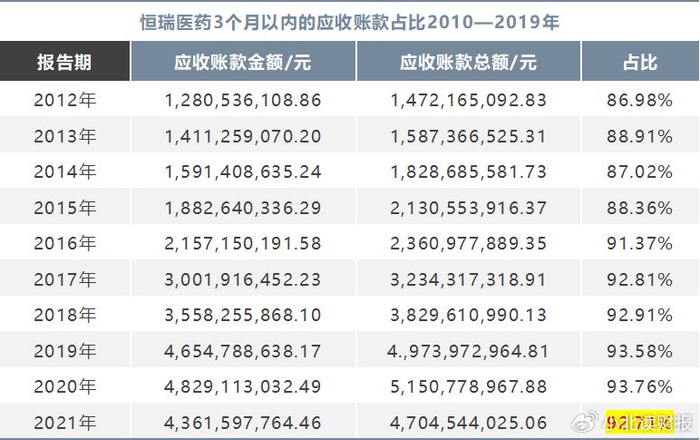 恒瑞医药回款时间在3个月以内的应收账款占应收账款总金额的比重一直在增加,在两票制开始落地的2016年,恒瑞账期回款时间在3个月以内的应收账款占比,竟然首次超过了90%。