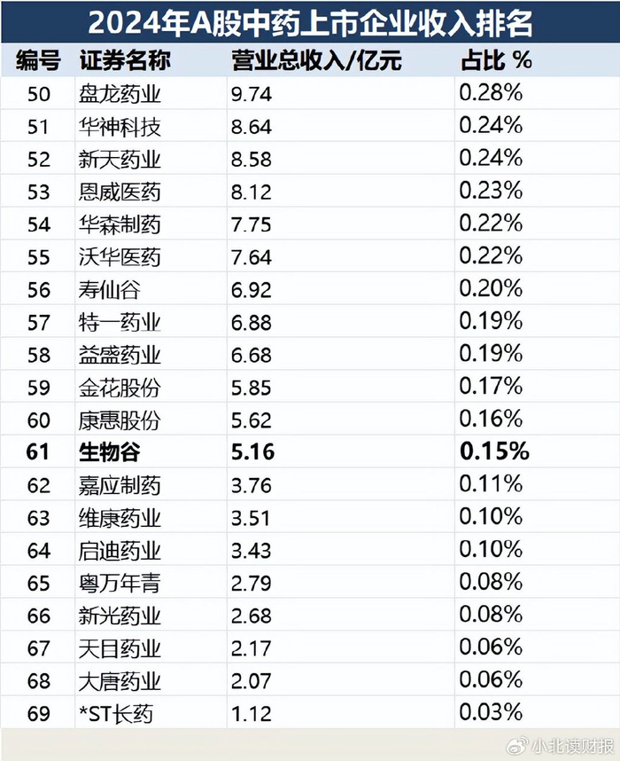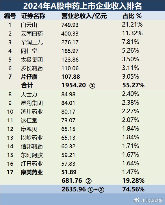 用2024年年报的总营业收入计算,69家中药企业的总营收为3535.48亿元,其中白云山一家公司创收749.93%亿元,占总营收的21.21%;云南白药创收400.33亿元,占总营收的11.31%。