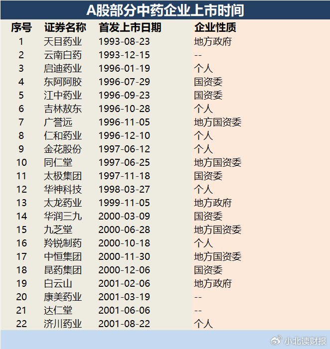 1990年代建立初期,A股的一个重要功能是为国企改革服务,帮助国企融资脱困,建立现代企业制度;刚好很多中药企业都是历史悠久的地方国企,比如云南白药、同仁堂和九芝堂。