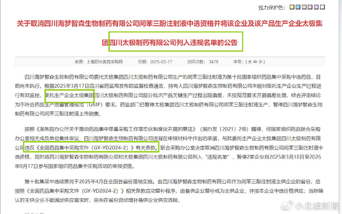 今年三月份,太极集团四川太极制药公司被列入违规名单,因为它代工生产的药品违规,四川公司的集采资质被暂停,持续到2026年9月17日才能再次参加集采。