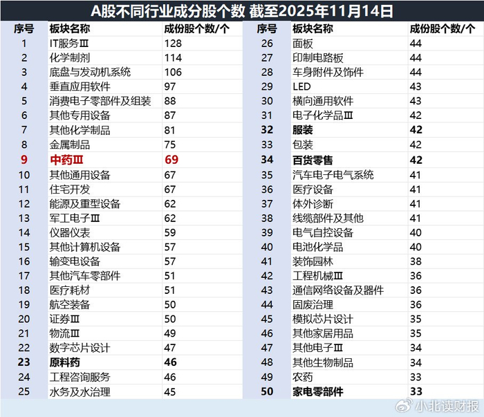 在259家个三级行业分类里,中药上市企业的数量排在第9位,可以说是榜上有名;排在它前面的是化学制剂、IT服务、专用设备等行业。