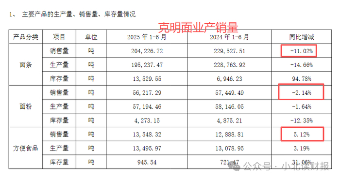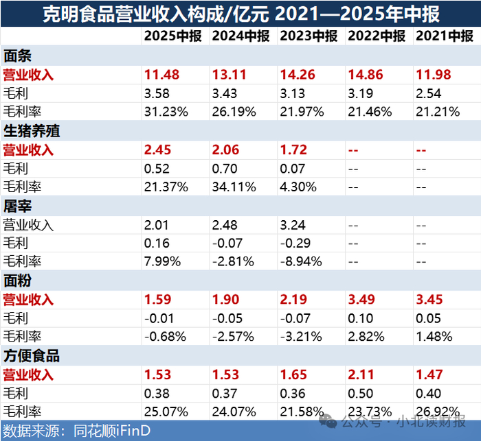 如下表所示,克明食品面条业务的营收自2023年开始下降,2025年上半年营收为11.48亿元,低于2021年的11.98亿元。