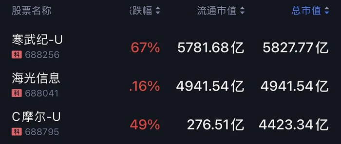 摩尔线程的总市值位居科创板第三,仅次于寒武纪(5828亿元)与海光信息(4942亿元)。